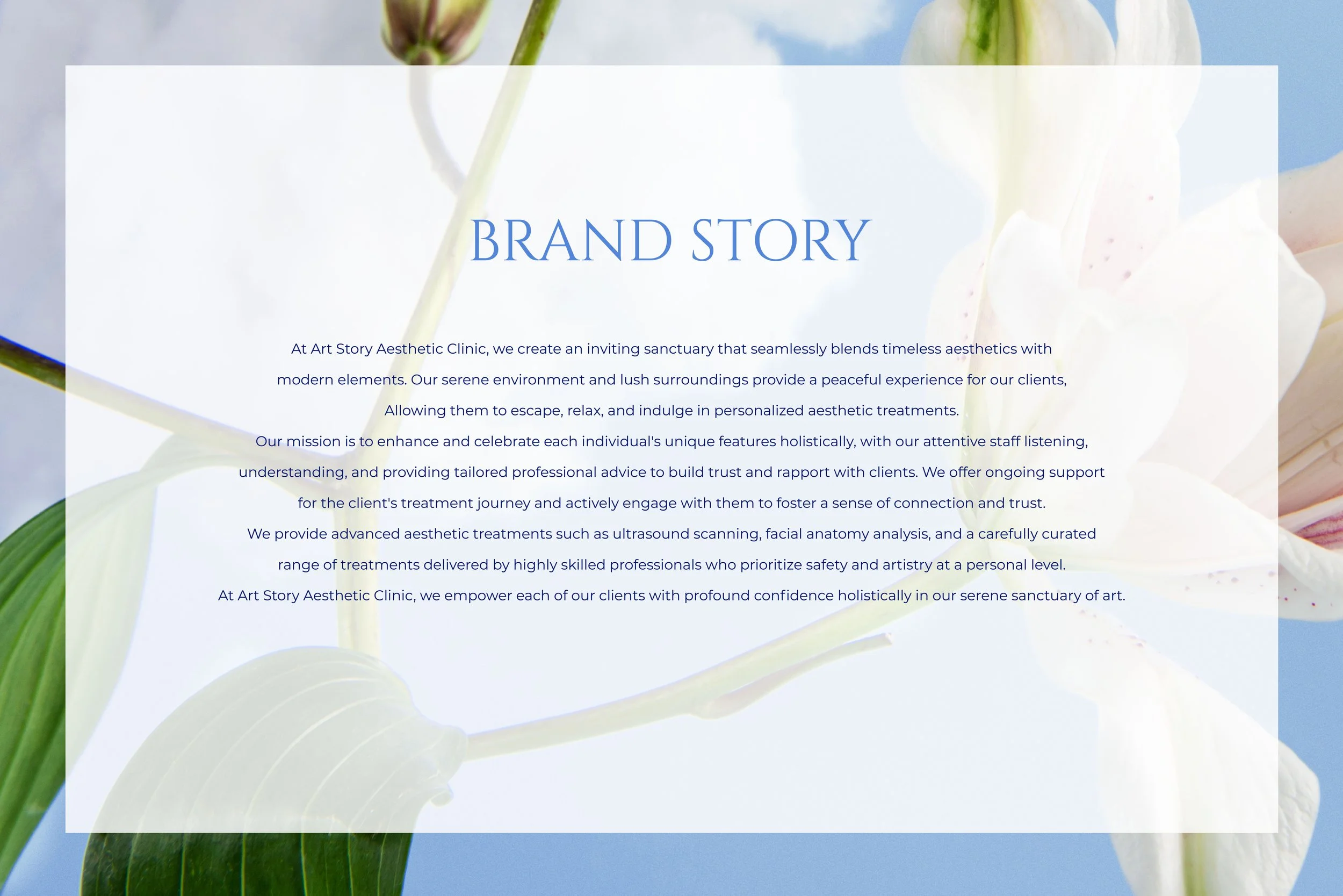 At the heart of Art Story Aesthetic Clinic's brand identity is a celebration of nature's unique artistry. Through close collaboration, we uncovered the clinic's core values of care, trust, and empowerment. Just as each blossom is distinct, the brand's graphic elements capture the individuality of every client's aesthetic journey. The striking and organic pattern of flowers symbolize the transformative results achieved through the clinic's holistic approach.