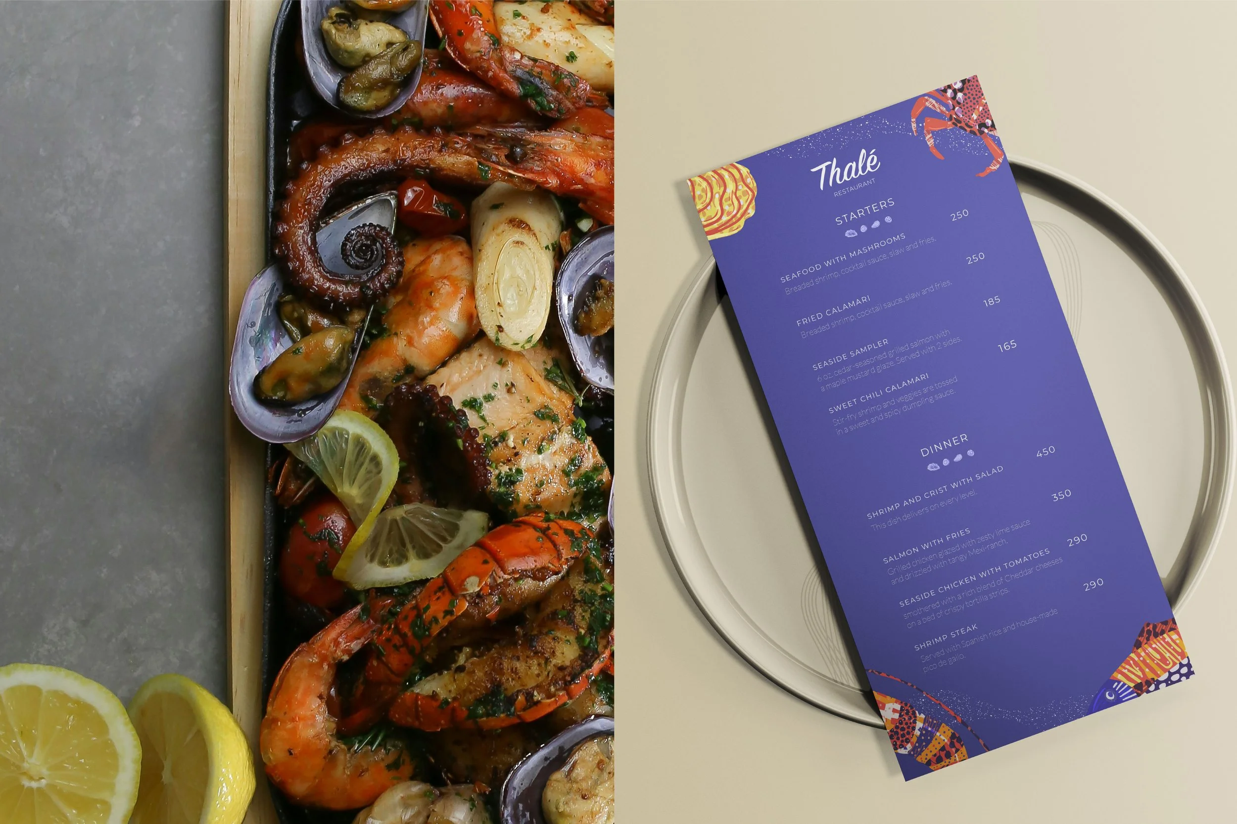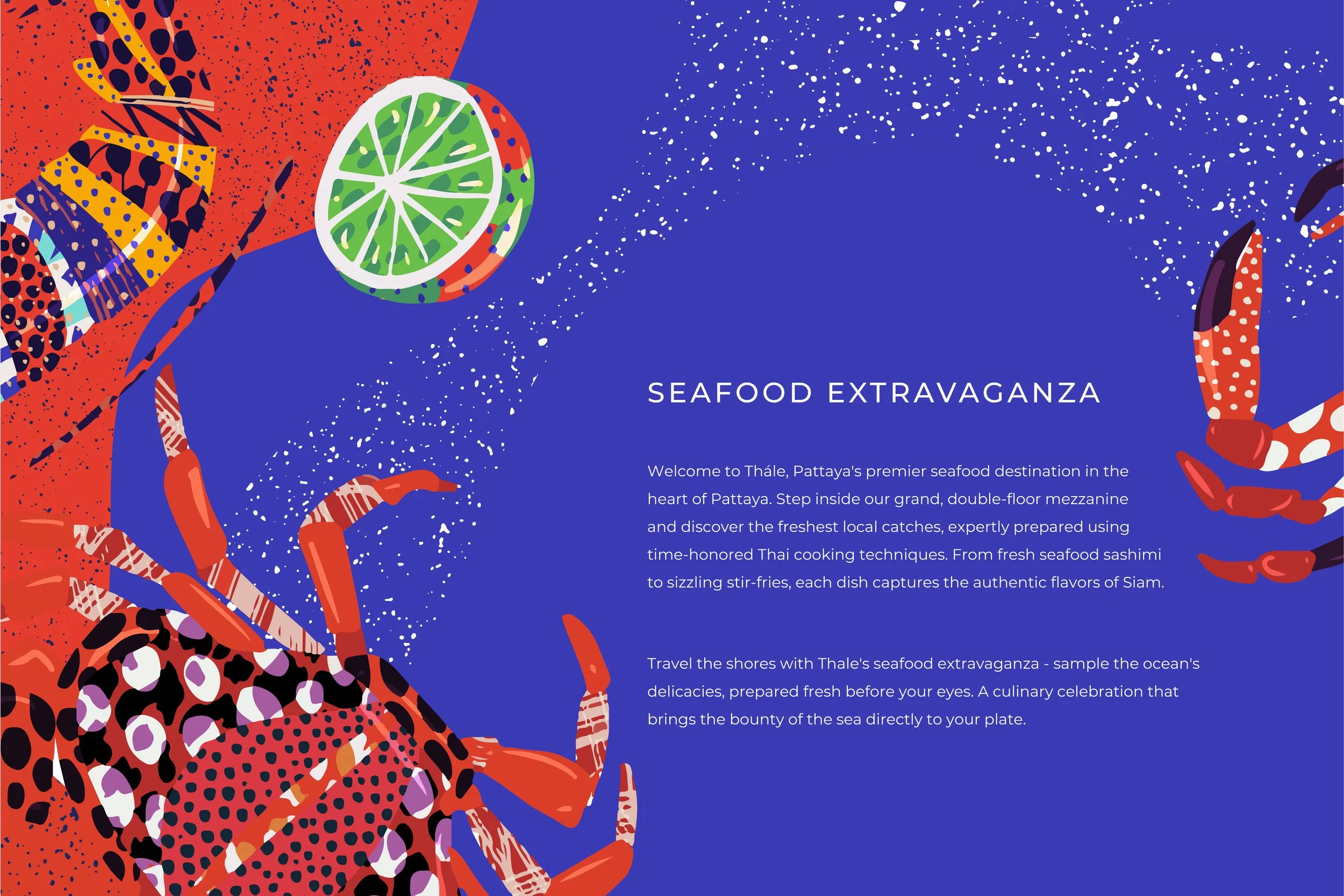 Our Seafood Extravaganza concept captures the essence of indulgence, combining passion and creativity in every detail. From brainstorming sessions to designing vibrant illustrations and engaging visuals, our team worked collaboratively to ensure that every element of Thalé resonates with seafood lovers. With this dedication, Thalé invites guests to enjoy an unforgettable feast for the senses.